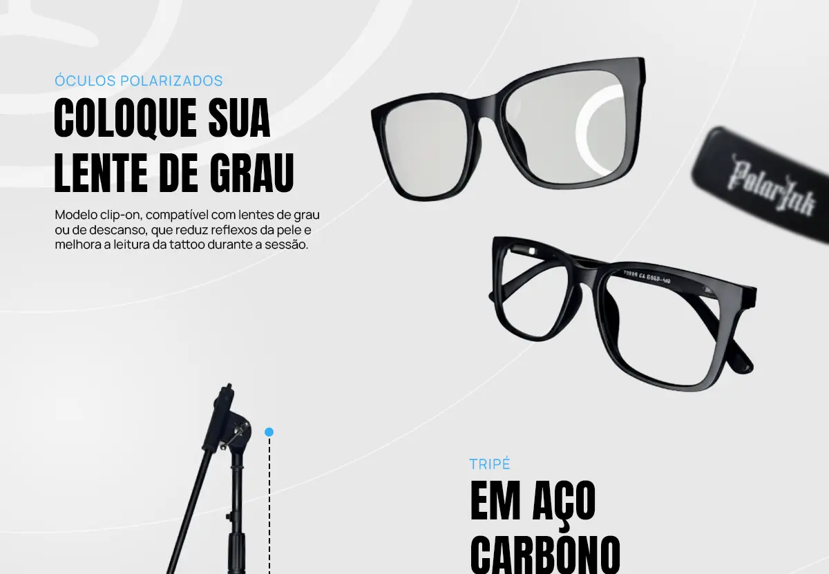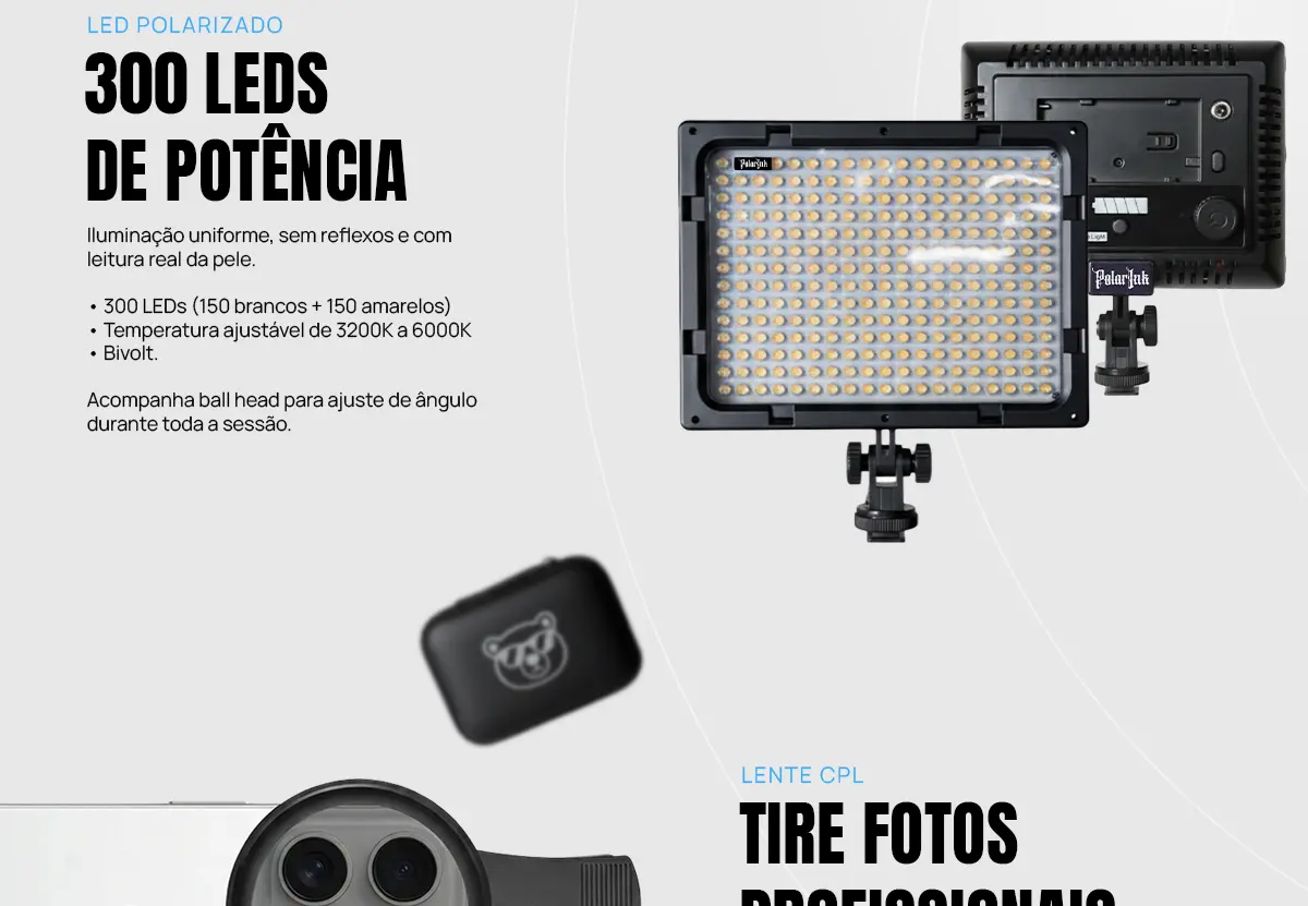 Kit completo com tudo que você precisa para que a polarização funcione corretamente durante sua sessão, removendo todo o reflexo da pele.