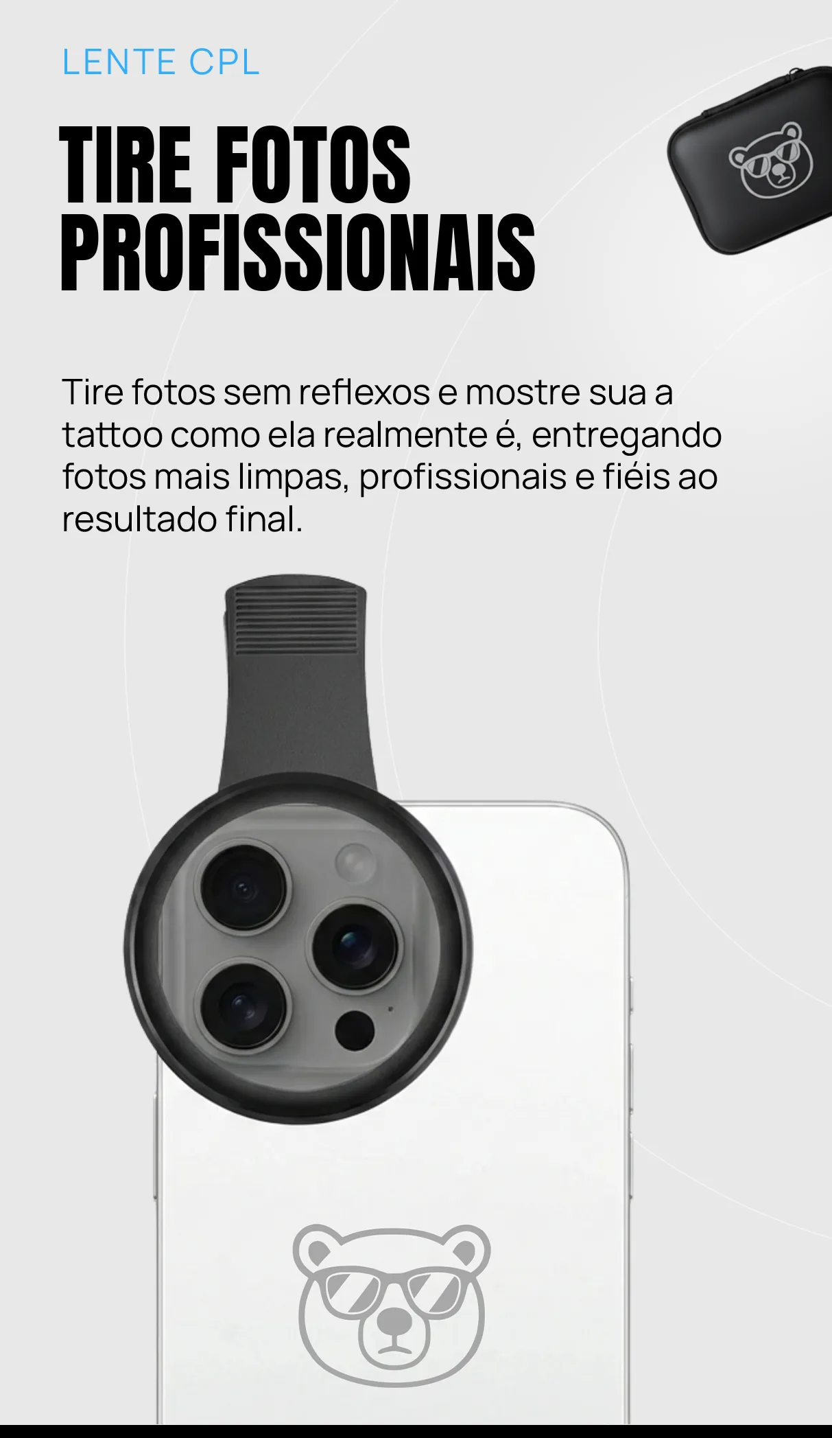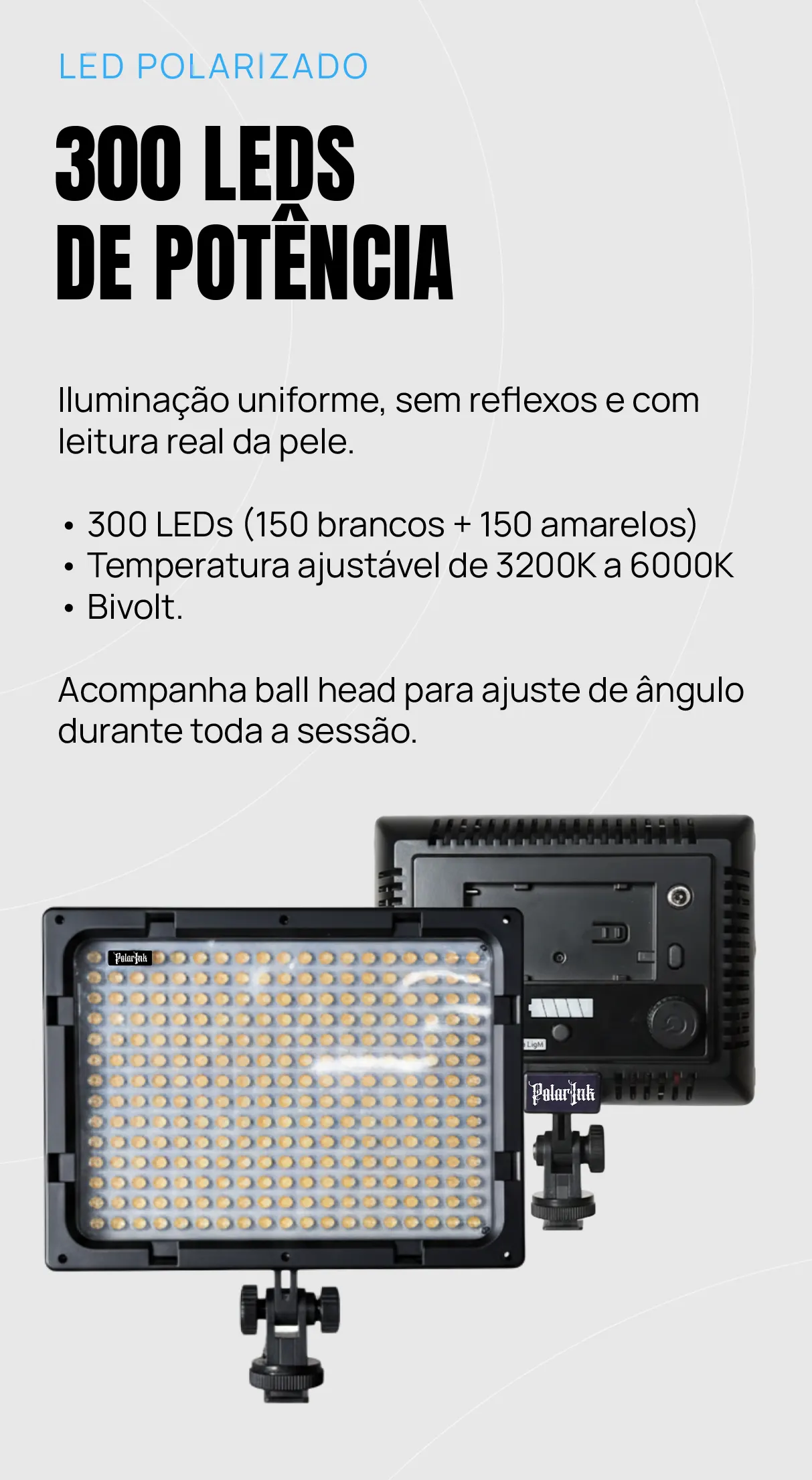 Kit completo com tudo que você precisa para que a polarização funcione corretamente durante sua sessão, removendo todo o reflexo da pele.